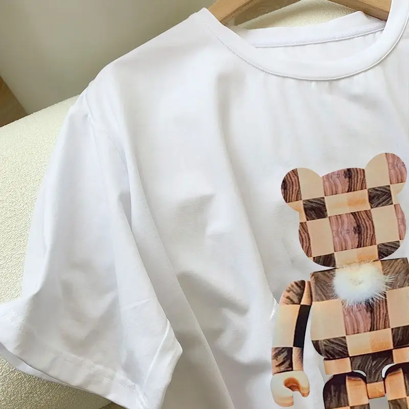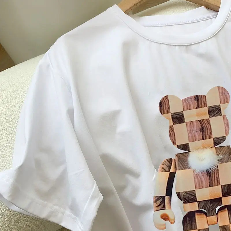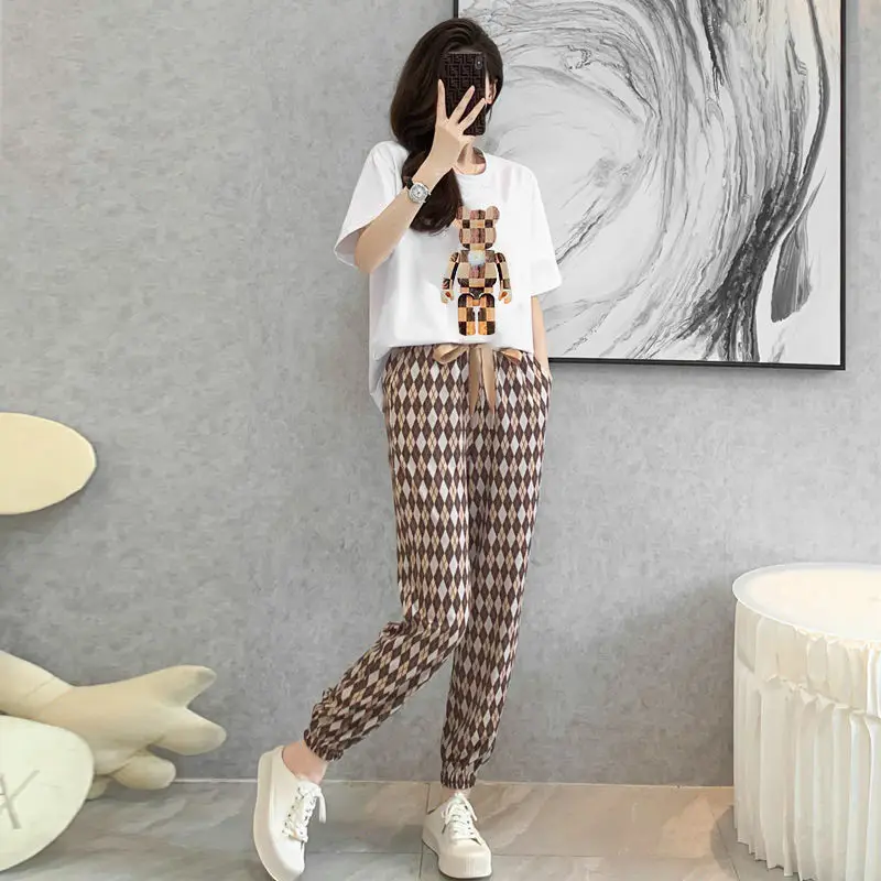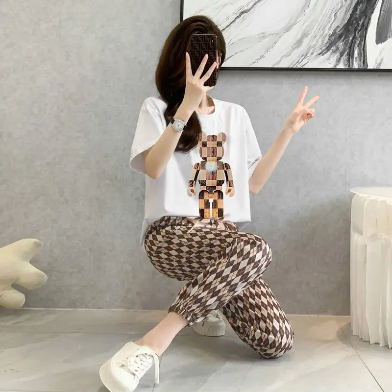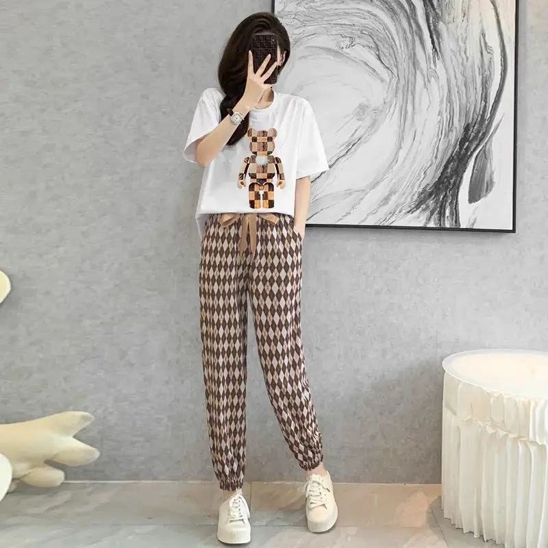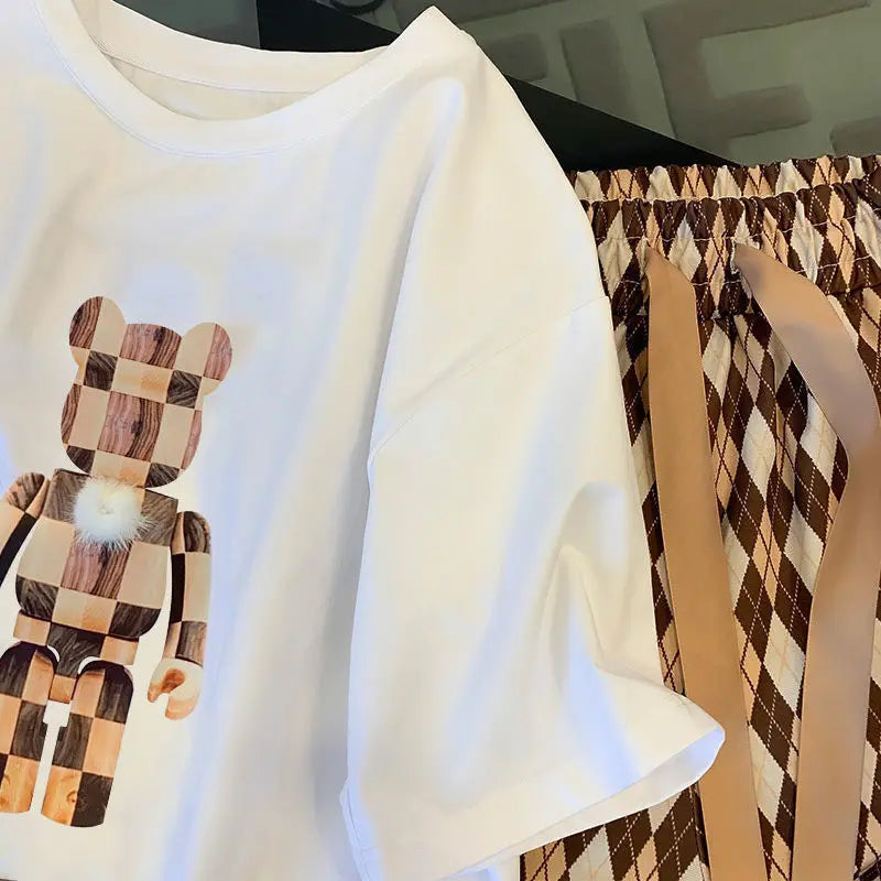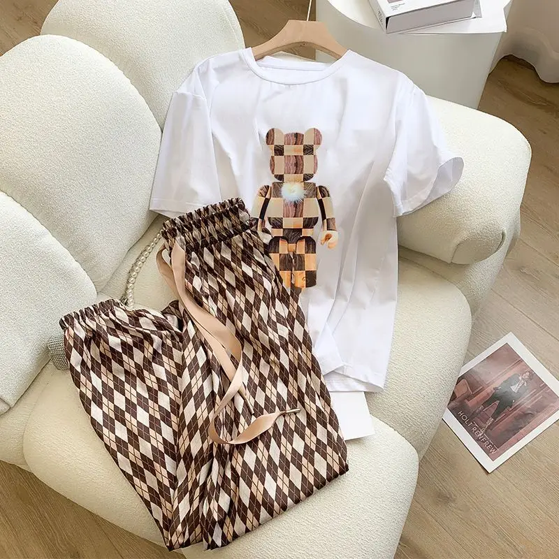 2 Piece Set for Women 2023 Summer Korean Fashion Bear Printed High Waist Wide Leg Pants Loose Short Sleeve T Shirt Women Clothes