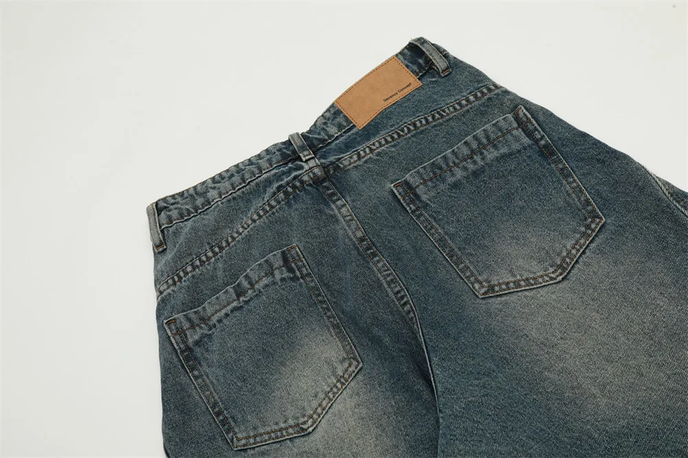 2025 New Mens Jeans Japanese Streetwear Washed Distress Scimitar Design Jeans Summer Fashion Casual Baggy Wide Leg Trousers Male