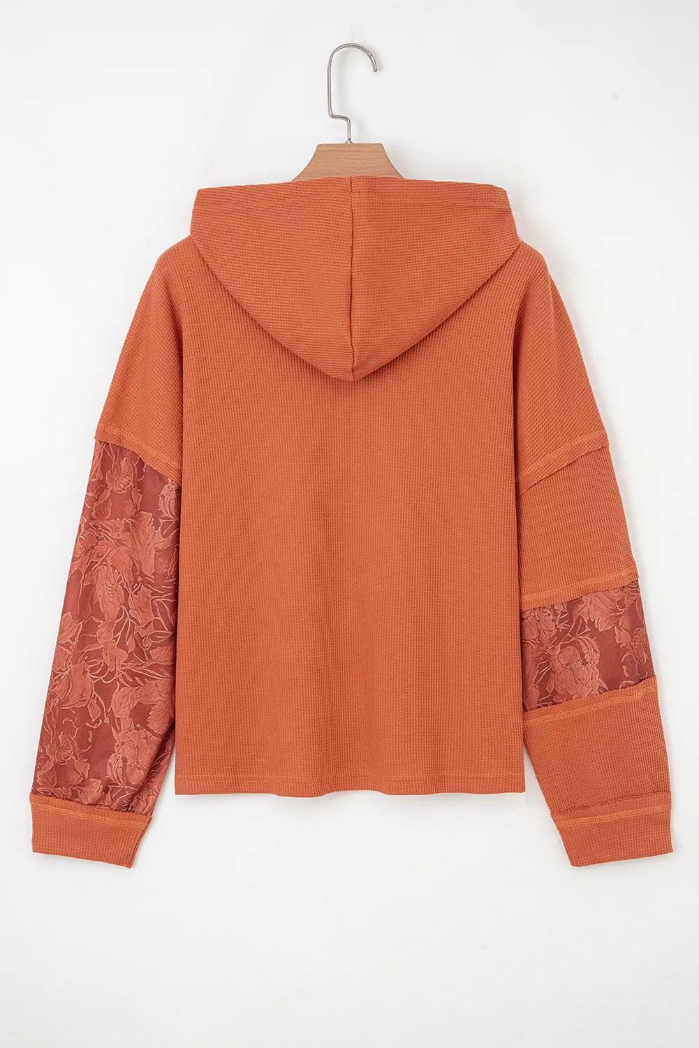Cinnamon Waffle Printed Patchwork Drawstring Hooded Long Sleeve Top