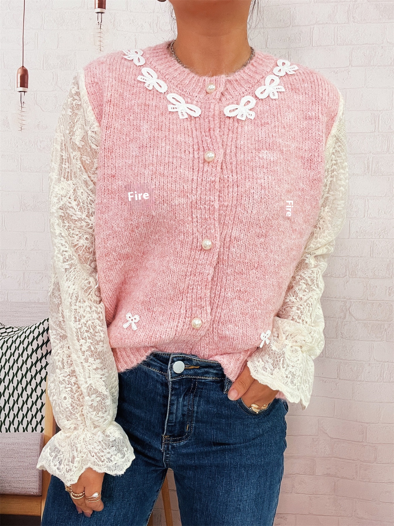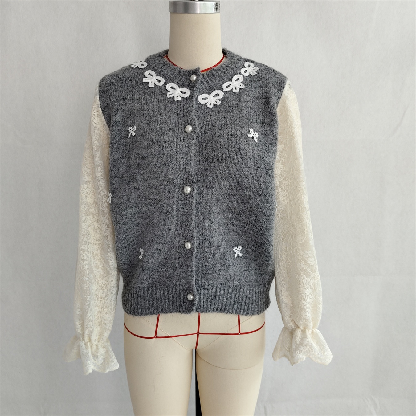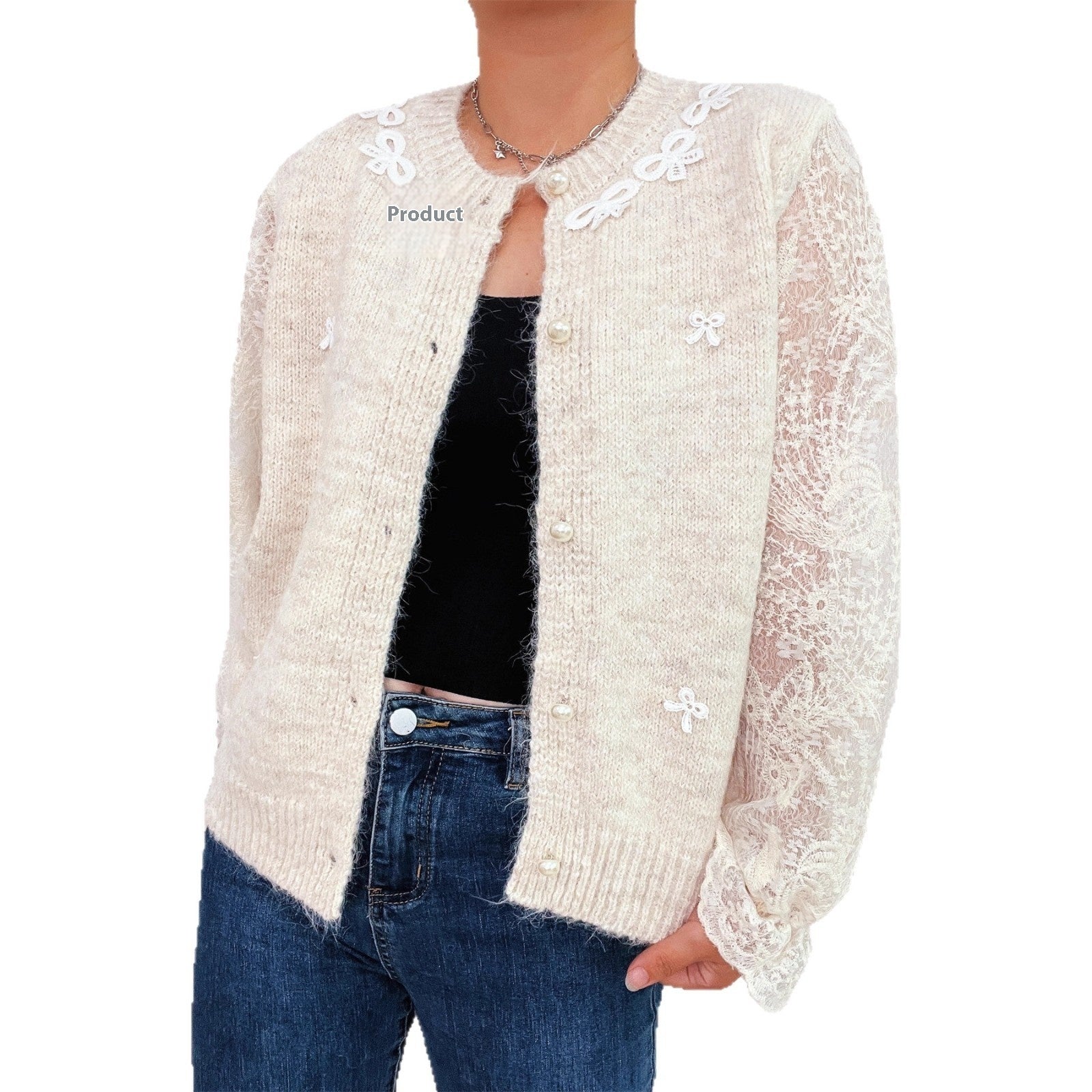 Commuter Lace Sleeves Stitching Bow Knitted Button Sweater Cardigan