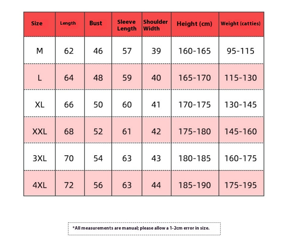 Size: M (recommend 47.50kg-57.50kg),L (recommend 57.50kg-65.00kg),XL (recommend 65.00kg-72.50kg),XXL (72.50kg-80.00kg recommended),3XL (80.00kg-87.50kg recommended),4XL (87.50kg-97.50kg recommended)