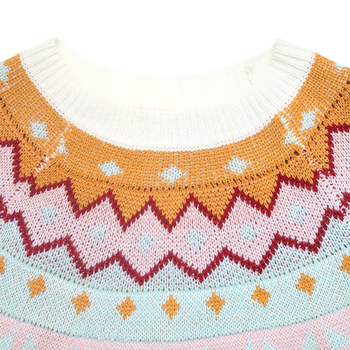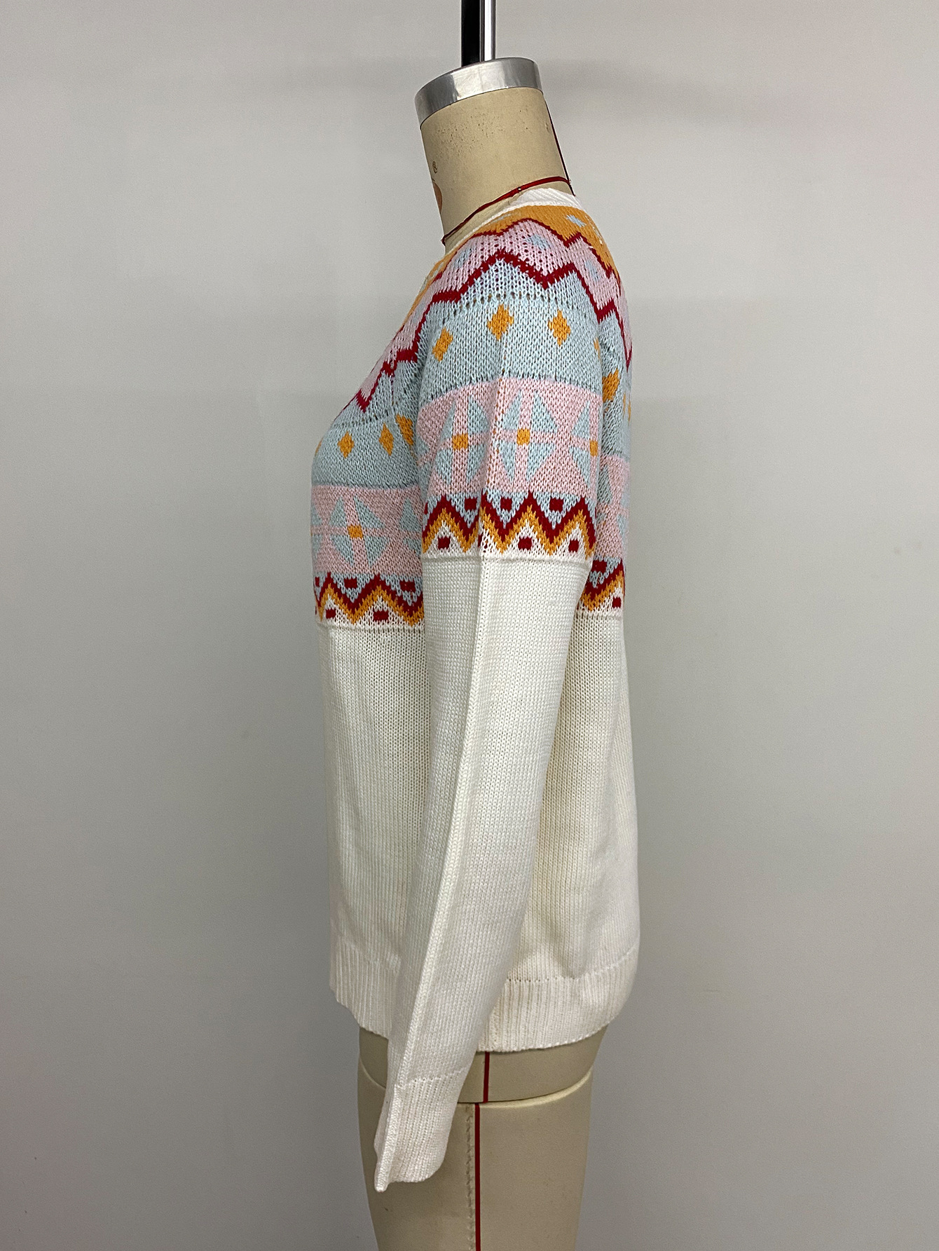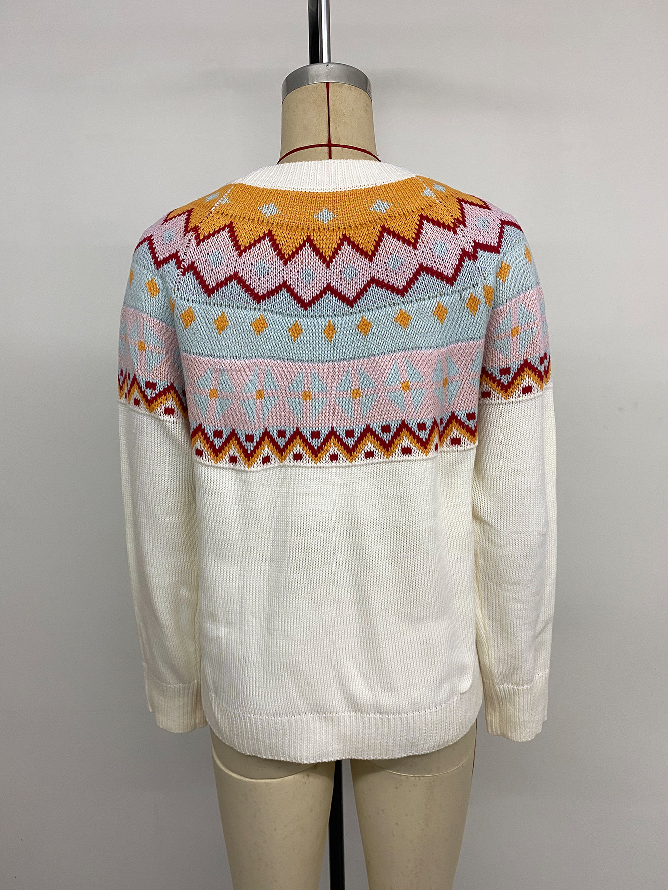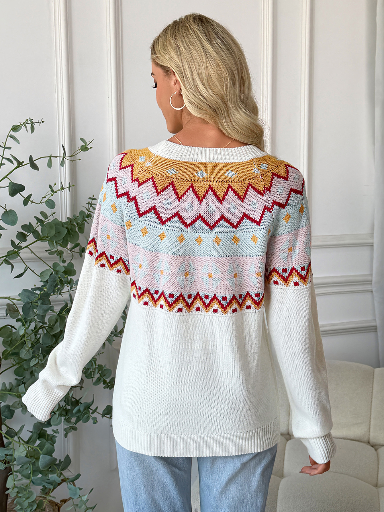 Contrast Color Jacquard Long Sleeve Round Neck Sweaters