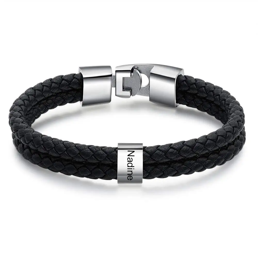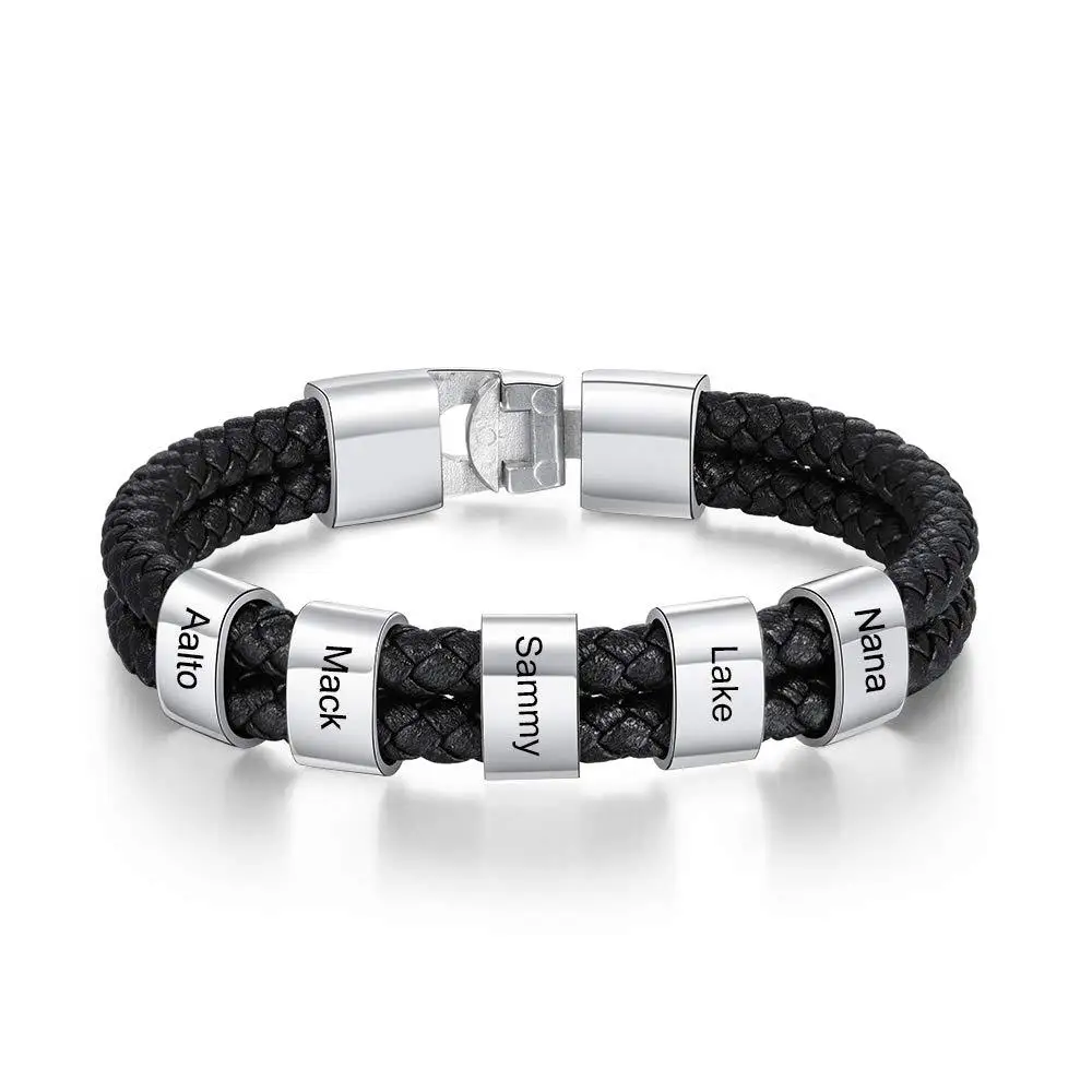 Custom Family Names Beads Bracelet Men Personalized Engraved Bracelets Black Leather Stainless Steel Bracelet Father's Day gift