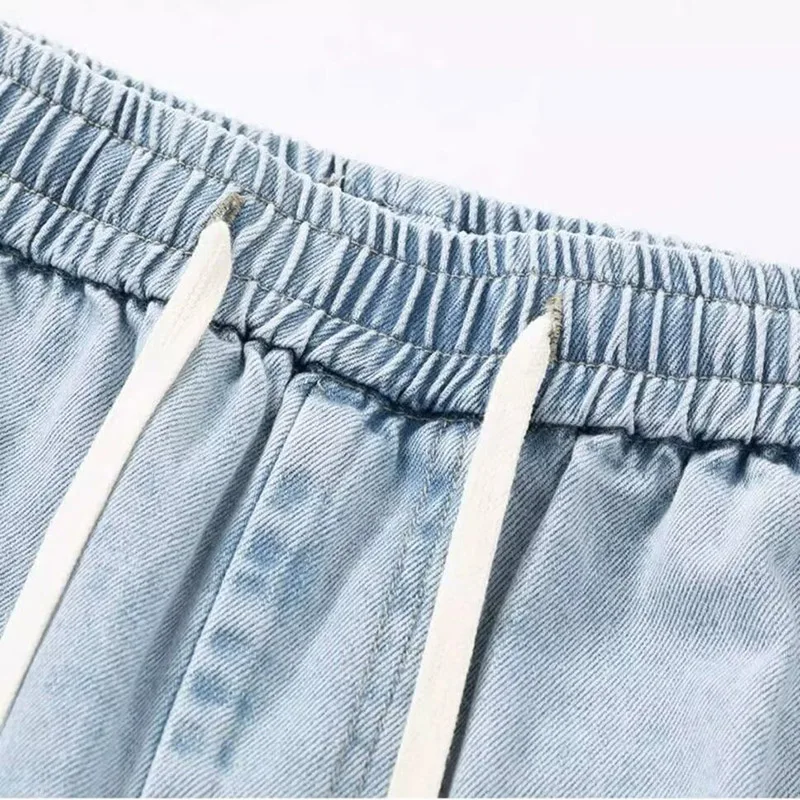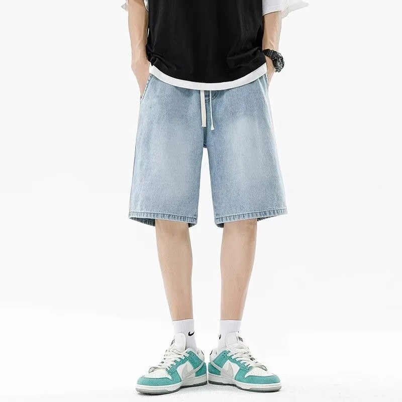 Men Casual Denim Shorts Male New Elastic Waist Straight Leg Comfortable Light Blue Soft Short Pants Baggy Wide Leg Jeans