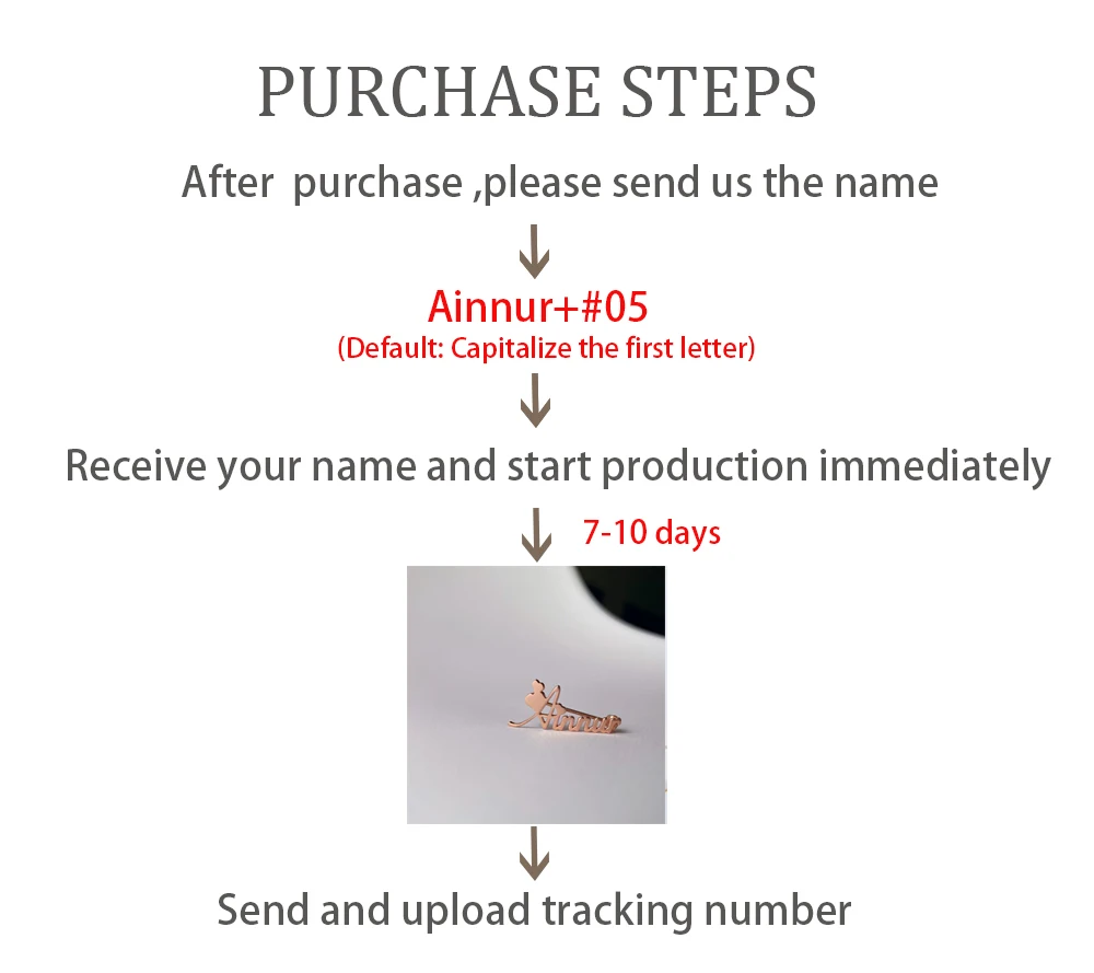 2.If you do not give us a customized name and font , we will contact you. If you still do not reply after three days, we will make a brooch according to your recipient's name and send it.