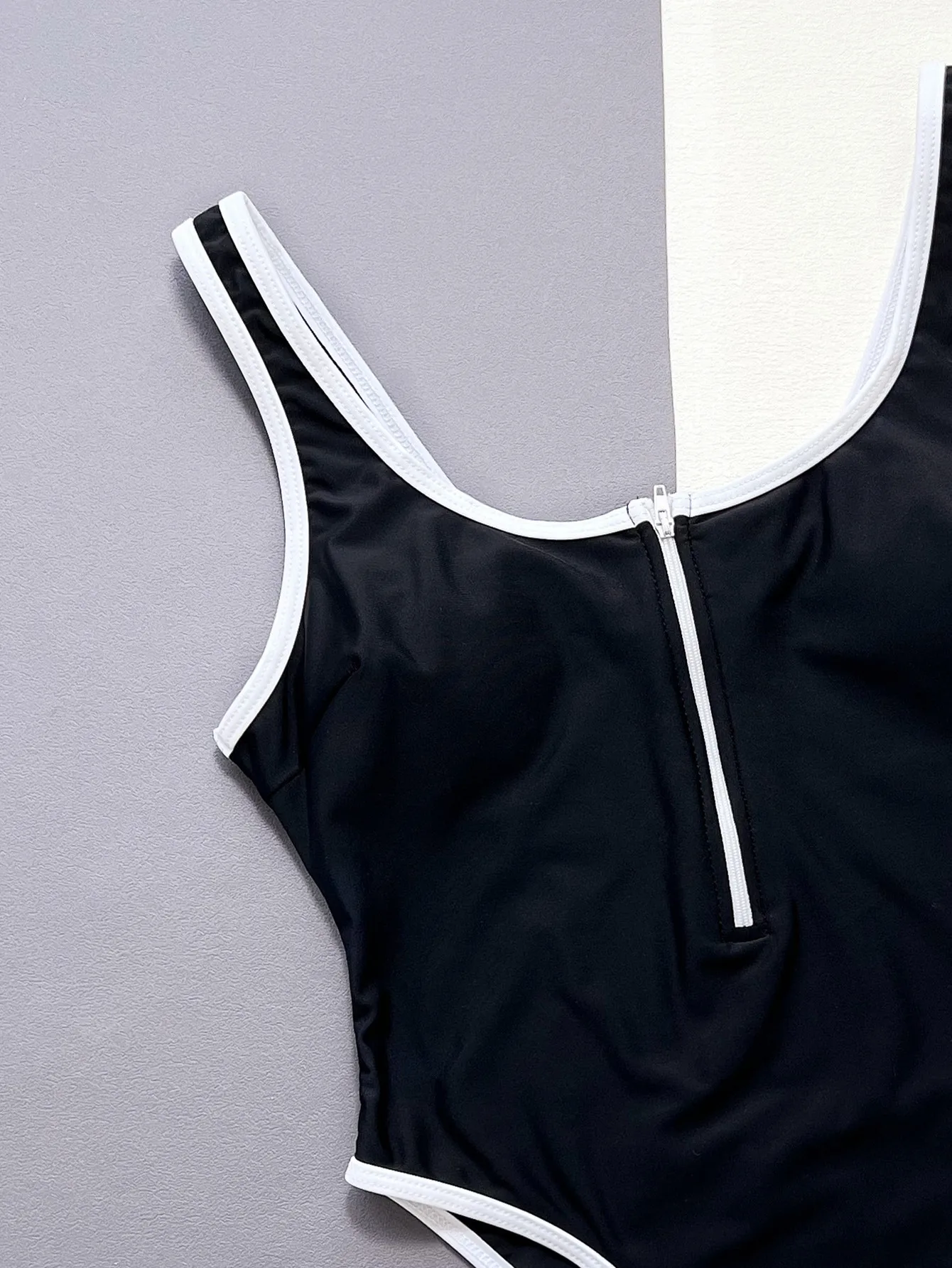 sexy zipper black white patchwork swimsuit one piece thong Bikinis Swimwear Swimsuits beach outfits bodysuit biquini tankini