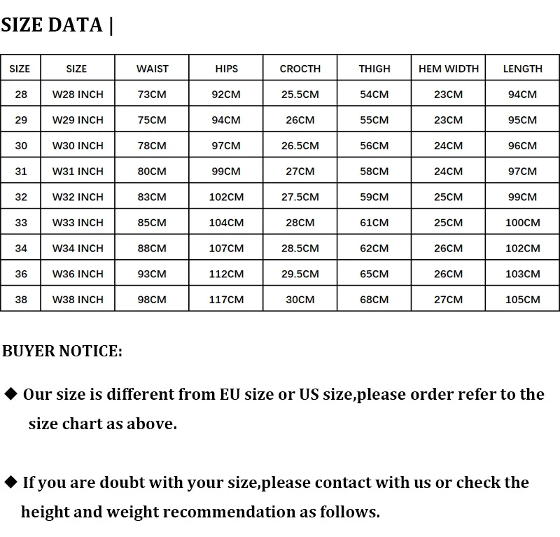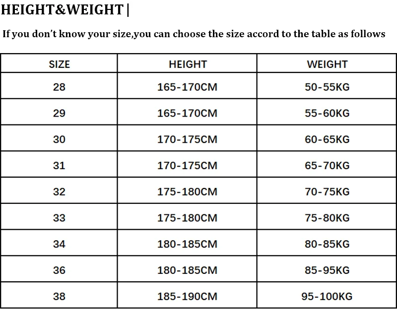 size_info: {"sizeInfoList":[{"length":{"cm":"72","inch":"28.35"},"size":"28(W28 INCH)","vid":-1},{"length":{"cm":"75","inch":"29.53"},"size":"29(W29 INCH)","vid":-2},{"length":{"cm":"78","inch":"30.71"},"size":"30(W30 INCH)","vid":-3},{"length":{"cm":"80","inch":"31.50"},"size":"31(W31 INCH)","vid":-4},{"length":{"cm":"82","inch":"32.28"},"size":"32(W32 INCH)","vid":-5},{"length":{"cm":"84","inch":"33.07"},"size":"33(W33 INCH)","vid":-6},{"length":{"cm":"87","inch":"34.25"},"size":"34(W34 INCH)","vid":-7},{"length":{"cm":"92","inch":"36.22"},"size":"36(W36 INCH)","vid":-8},{"length":{"cm":"97","inch":"38.19"},"size":"38(W38 INCH)","vid":-9}]}