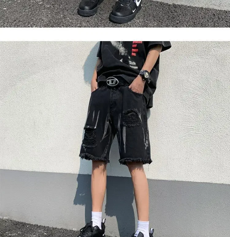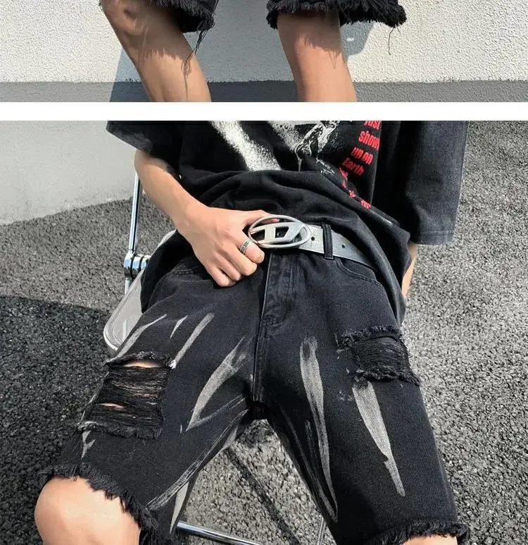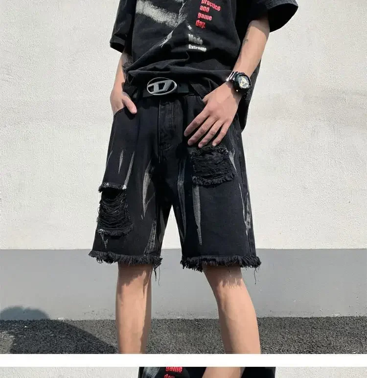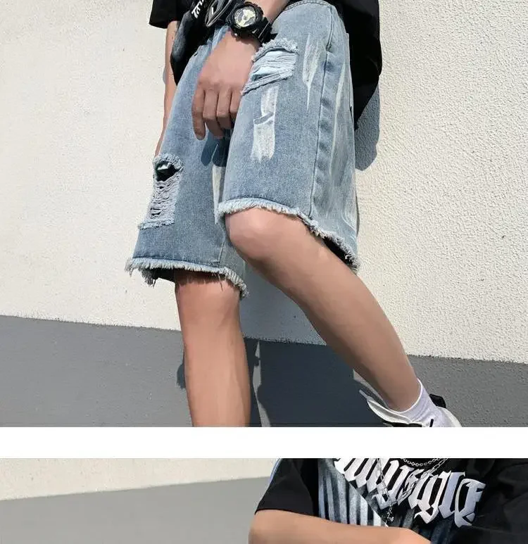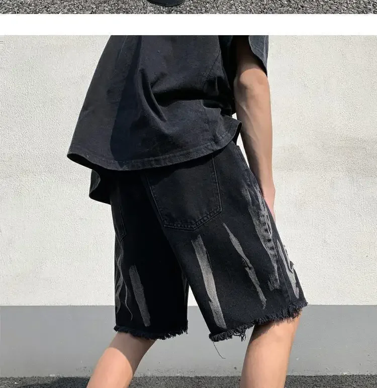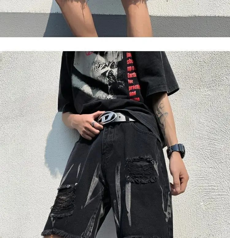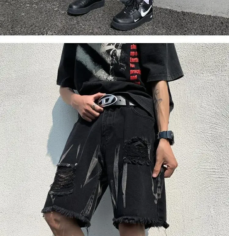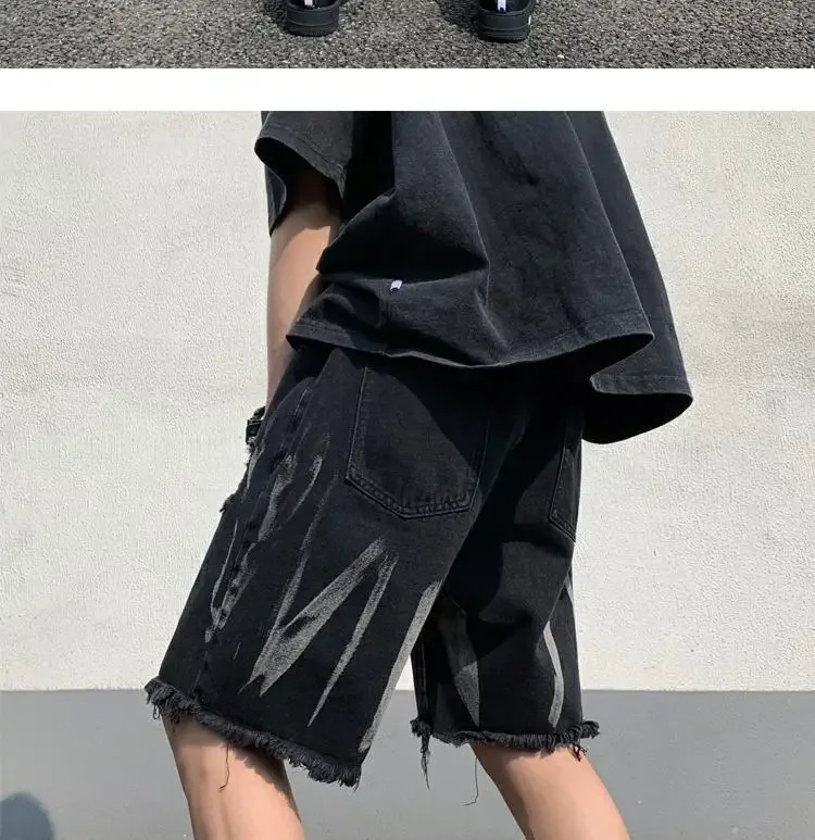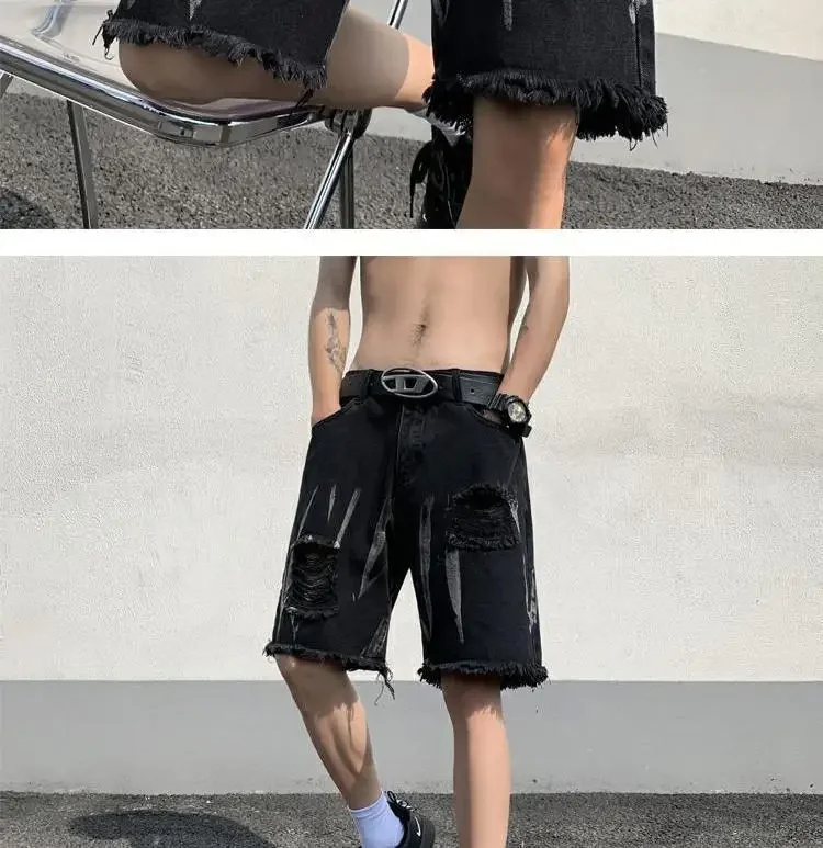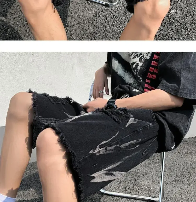 Tie-dye Furnished Denim Shorts Men's Ripped High Street Design Over-the-knee Five-point Pants