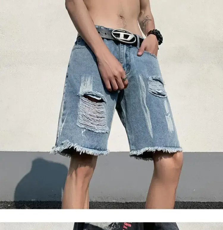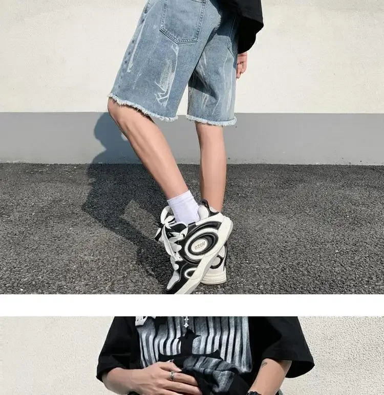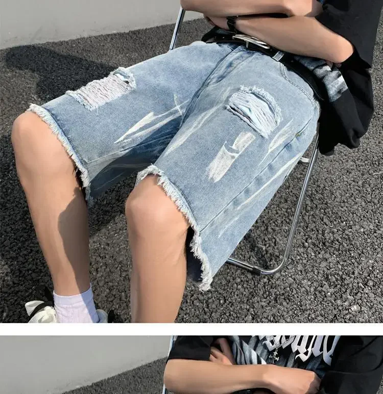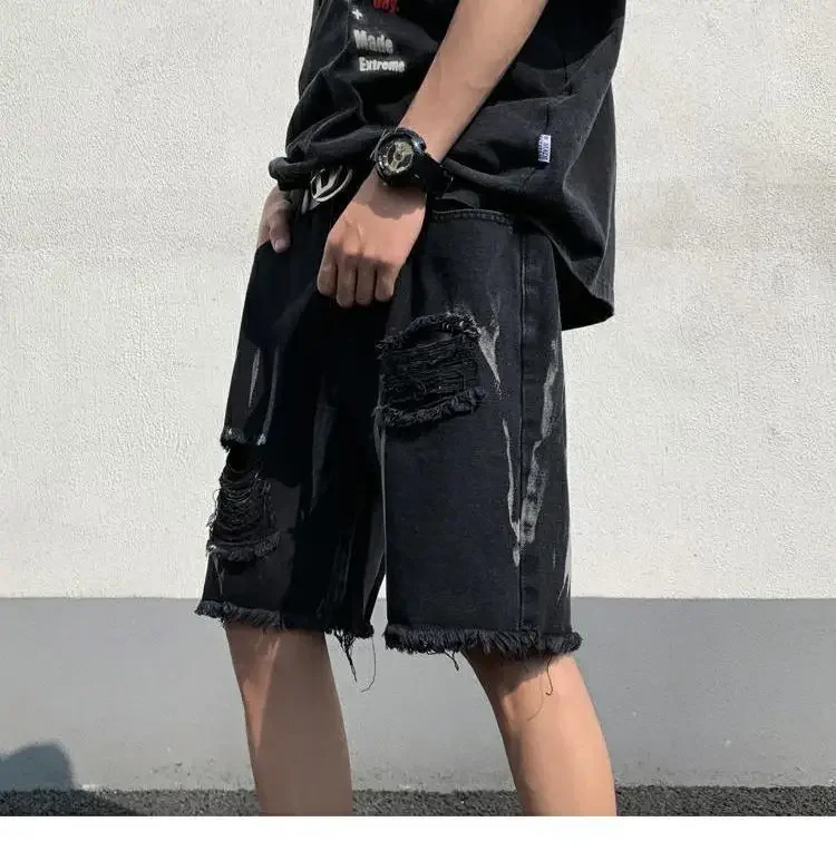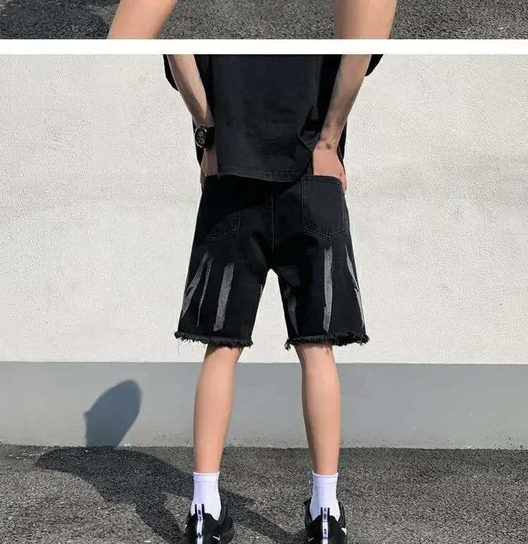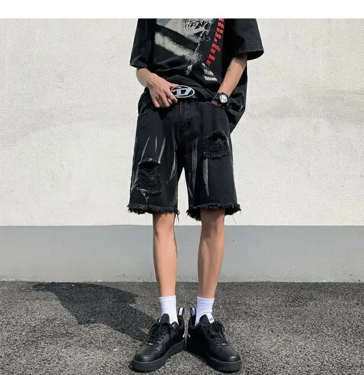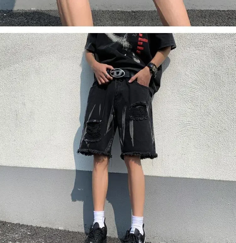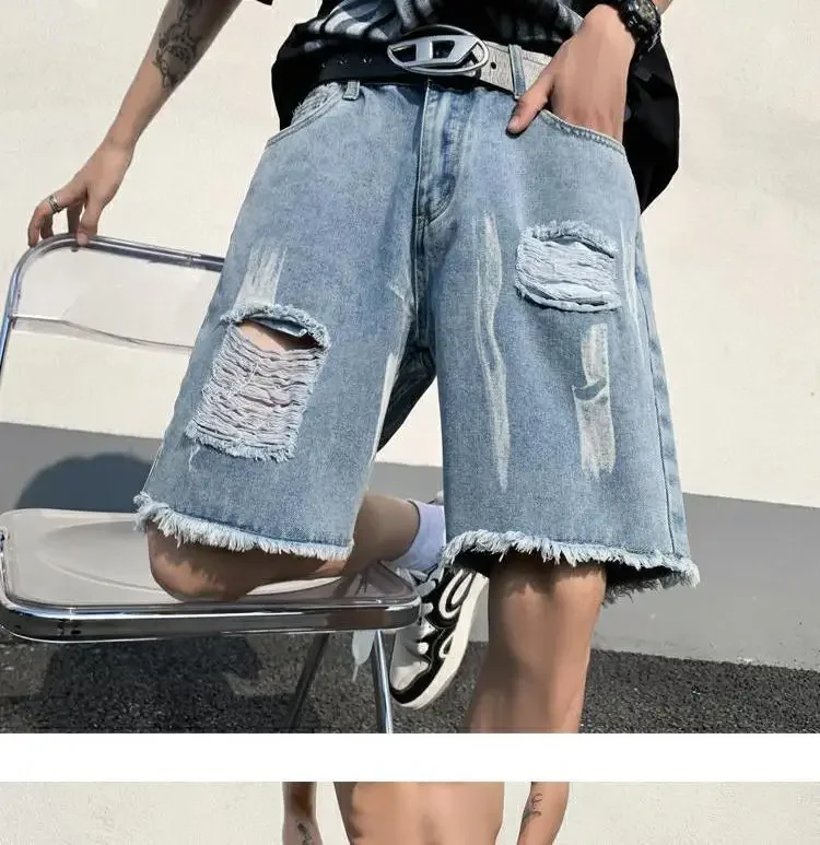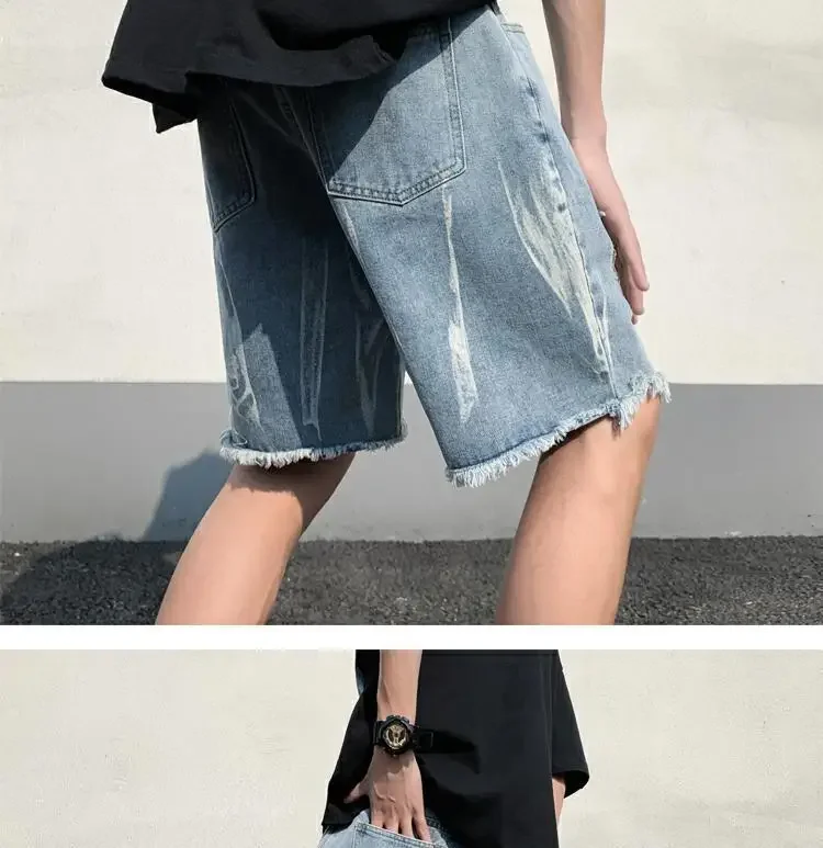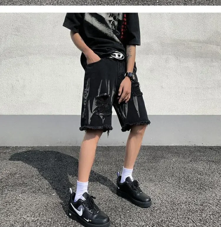 Tie-dye Furnished Denim Shorts Men's Ripped High Street Design Over-the-knee Five-point Pants